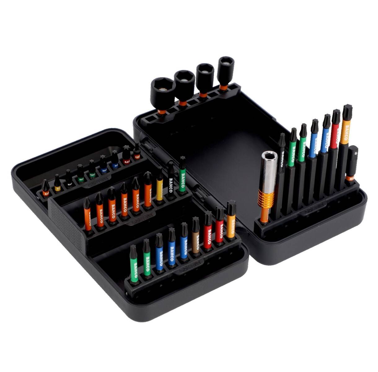Das BAHCO 1/4 Zoll Impact Torsion Bit Set 66IM/40C-1 eignet sich für präzise Arbeiten mit Phillips, Pozidriv, TORX® und Sechskantschrauben. Das Profi-Set enthält vierzig hochwertige Bits aus leistungsstarkem legiertem Stahl, ideal für die Verwendung mit Schlagschraubern und in harten Materialien. Die Torsionszone verteilt effektiv die Kräfte, absorbiert Drehmomentspitzen und verhindert vorzeitigen Bitbruch, was die Lebensdauer erheblich verlängert. Dank farbcodierter Hülsen lassen sich TORX®-Bits einfach identifizieren, und der 75 Millimeter lange magnetische Schnellwechsel-Bithalter mit Verriegelungssystem gewährleistet sicheren Halt und schnellen Bitwechsel. Das Set kommt in einem robusten, glasfaserverstärkten Koffer, der die Bits schützt und eine organisierte Aufbewahrung ermöglicht. Die patentierte 180-Grad-Verriegelung hält den Koffer offen, verhindert ein unbeabsichtigtes Schließen und bietet flexible Aufbewahrungsmöglichkeiten durch die abnehmbare Deckel- und Bodenkonstruktion. Die drehbaren Racks optimieren den Platz und erleichtern den Zugriff auf die Bits.