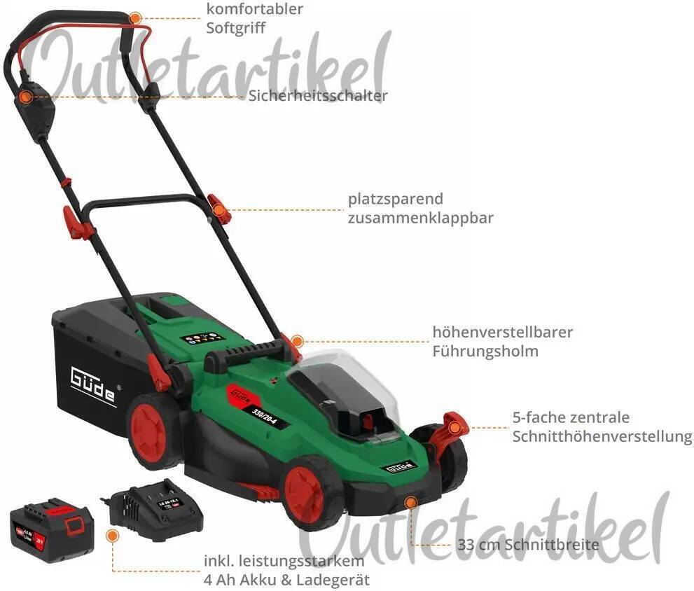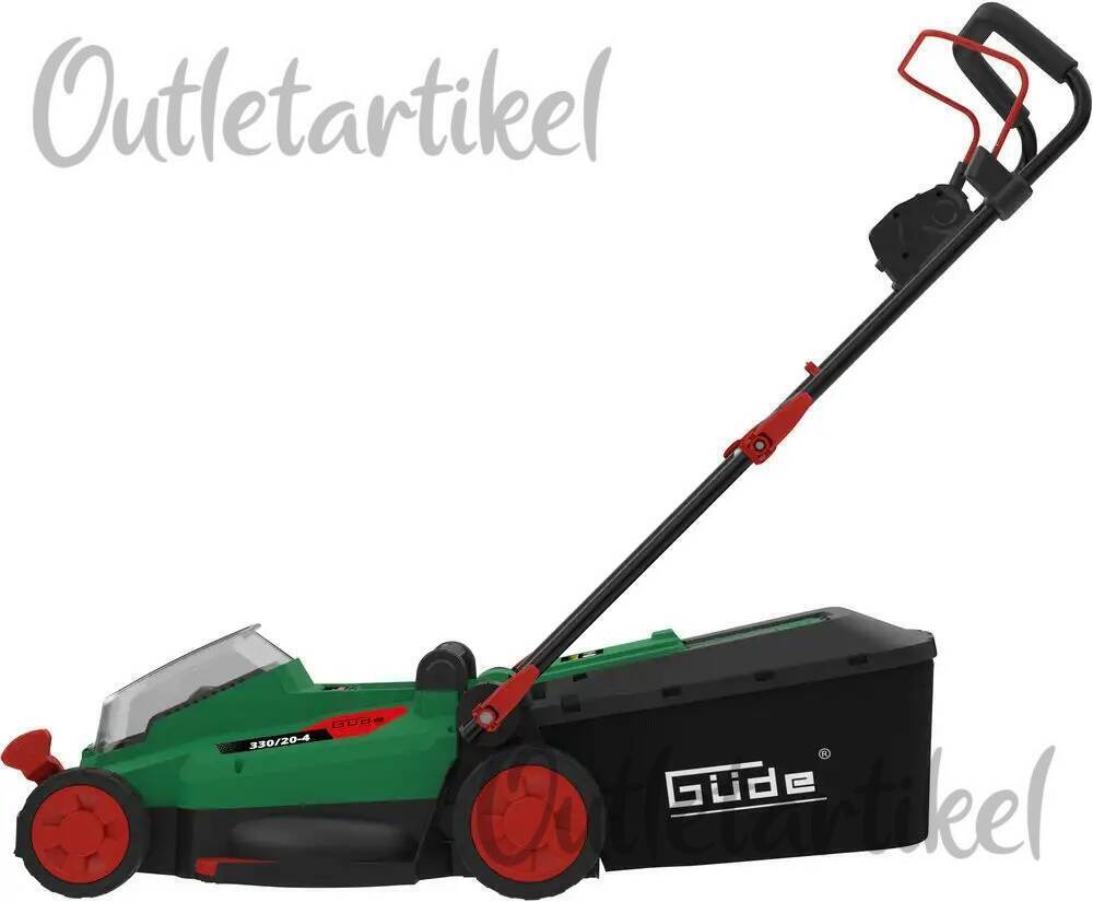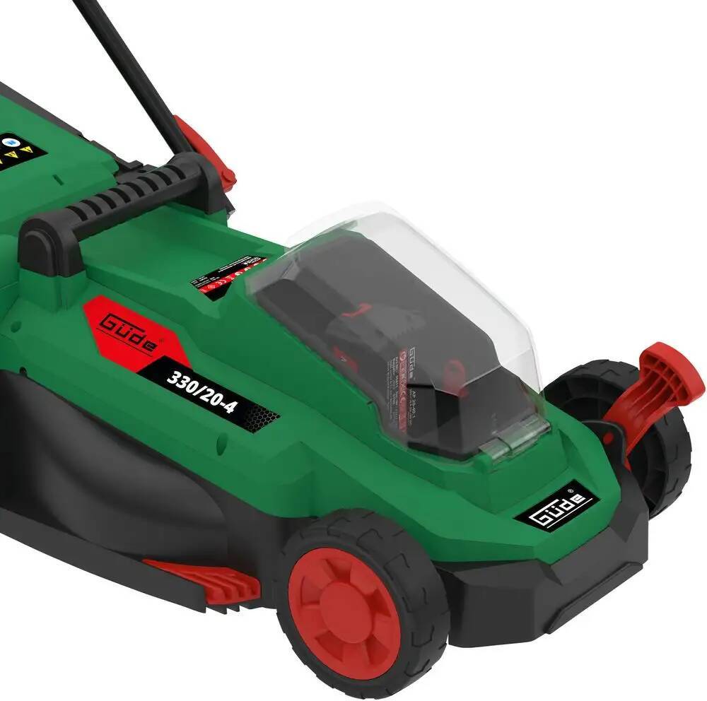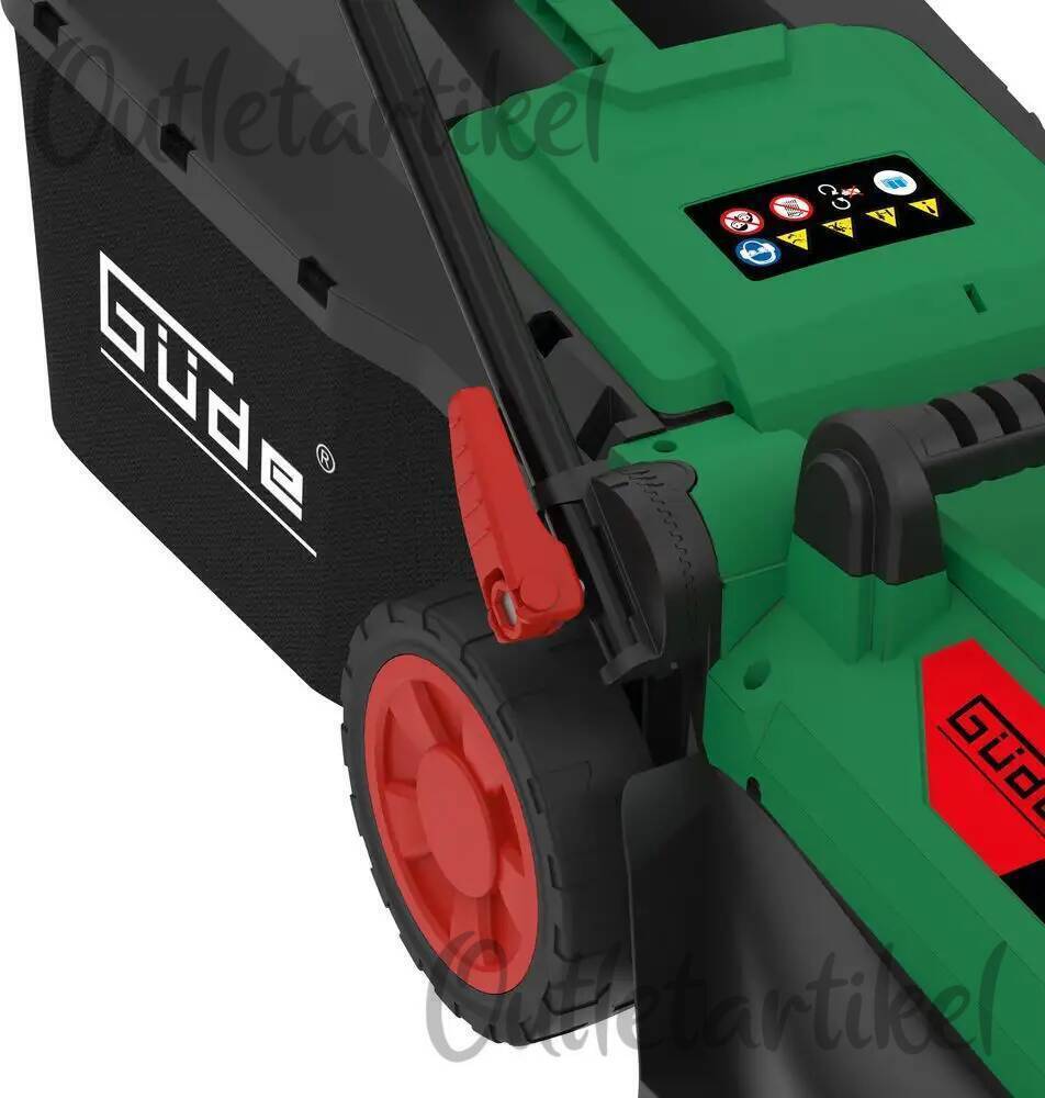 Güde stattet den 330/20-4 mit einer fünffach einstellbaren Schnitthöhenverstellung aus. Diese reicht von 25 Millimetern in der tiefsten Einstellung, bis 75 Millimetern in der höchsten. Bei diesem Akku-Rasenmäher der Premium Klasse lässt sich der ergonomisch gestaltete Führungsholm komfortabel höhenverstellen und bei Bedarf einklappen. Softgriff sorgt dabei für angenehme Griffigkeit gerade bei längeren Arbeitseinsätzen. Der Güde Mäher 330/20-4 besitzt einen half/half Fangkorb mit gut sichtbarer Füllstandsanzeige. Das Fassungsvermögen des Korbs beträgt laut technischem Datenblatt 30 Liter.