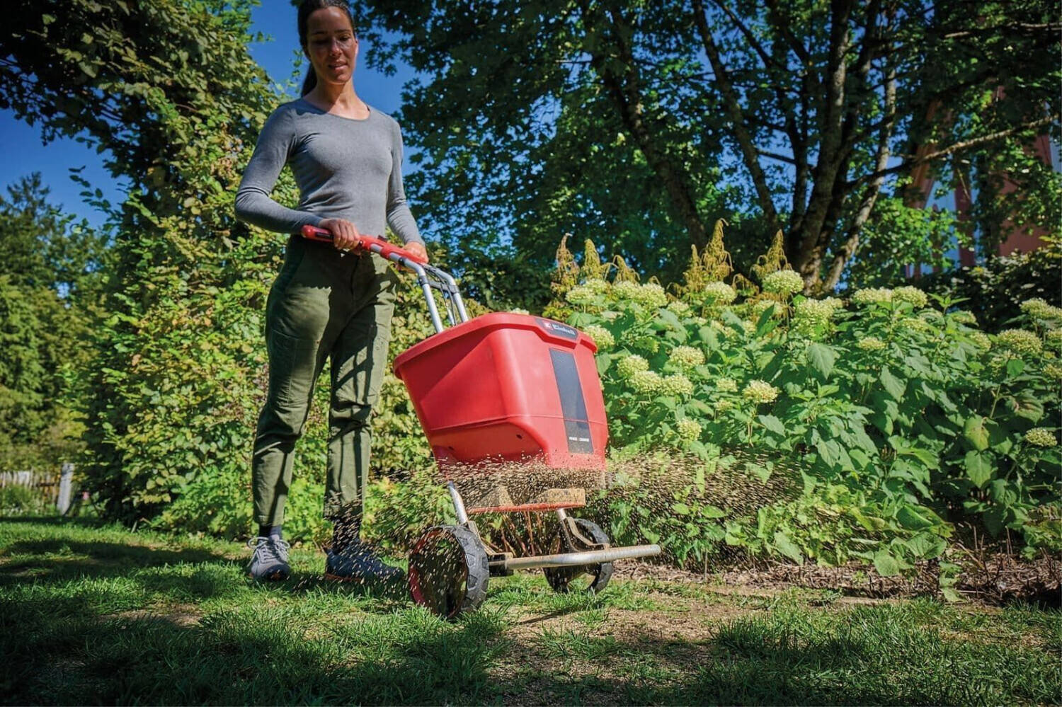 Der Behälter bietet Platz für bis zu 22 Liter Streugut. Das ist besonders bei größeren Flächen von Vorteil. Hier entfällt der eine oder andere Gang zur Streugut-Quelle. Der Einhell Akku-Streuwagen GE-SR 18/22 Li-Solo überzeugt zudem durch seine großen Räder. Gepaart mit seinem leichten und stabilen Schubbügel aus Aluminium lässt sich der Helfer ohne Mühen bewegen. Ein ergonomischer Handgriff mit Softgrip sorgt gleichzeitig für eine entspannte Haltung gerade bei längeren Einsätzen oder unebener Fläche. So bringst du dein Streugut gleichmäßig auf den Boden. Akku und Ladegerät sind beim GE-SR 18/22 Li-Solo nicht im Lieferumfang enthalten. Erwerbe sie separat, zum Beispiel als Starter- oder Doppelpack-Set. Egal welche der vier Jahreszeiten, mit dem Akku-Streuwagen GE-SR 18/22 Li-Solo aus dem Hause Einhell bist du gut aufgestellt