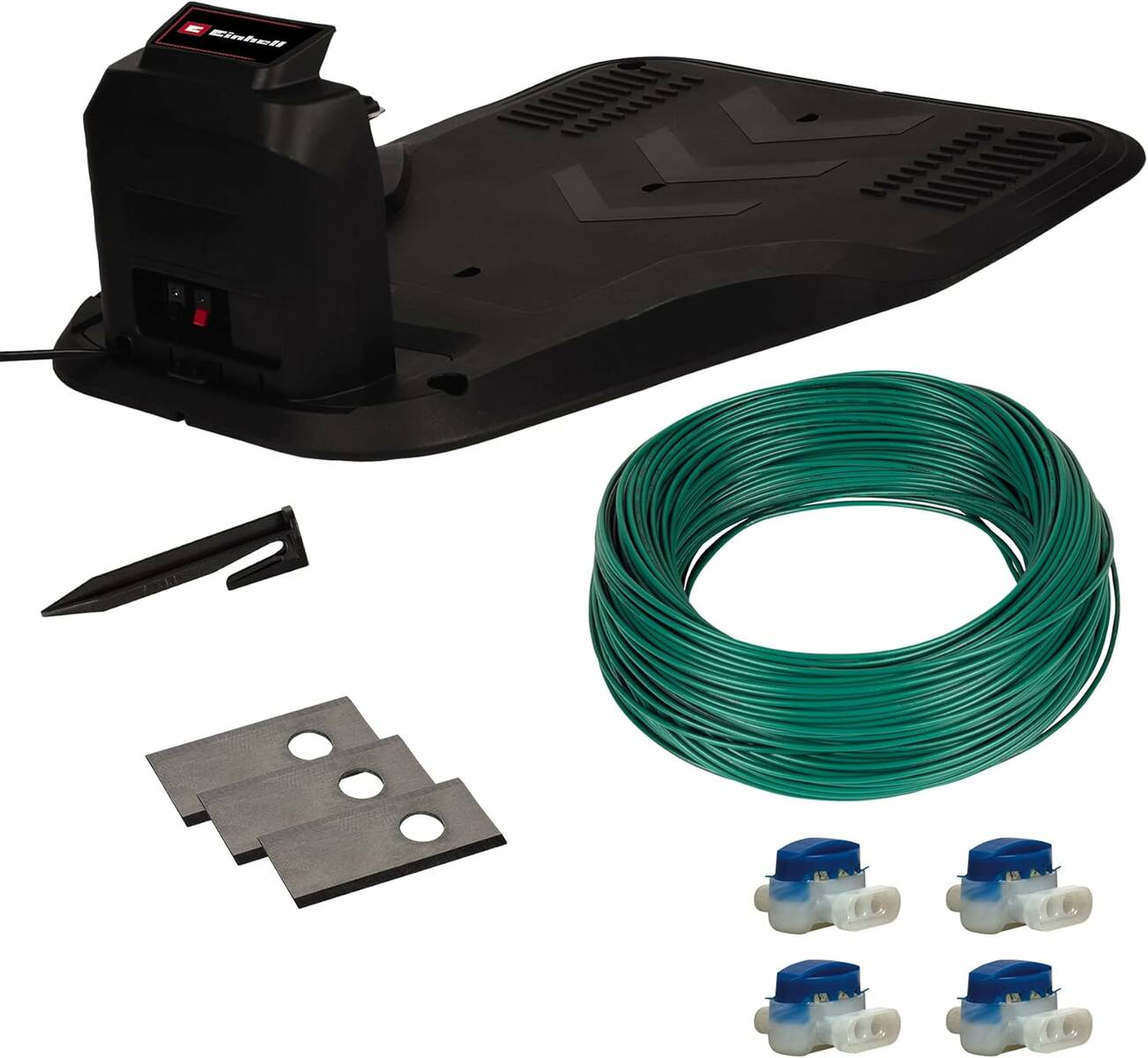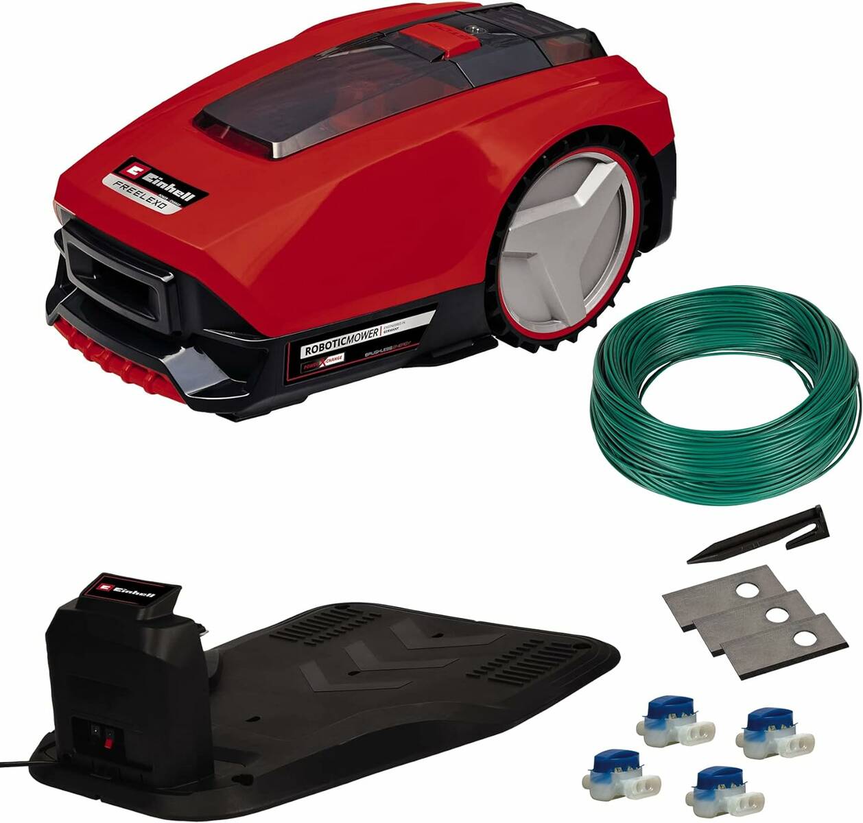 Apropos Sicherheit. Diese steht an erster Stelle bei Einhell. Stoß-, Kipp- und Hebesensoren gewährleisten einen sicheren Betrieb. Auf die Sicherheitssensorik bei Einhell ist Verlass. Bei Regen fährt der FREELEXO 300 Solo eigenständig zur Ladestation zurück. Rückkehr zur Ladestation sowie Ladevorgang erfolgen automatisch. Mit seiner Steigungstauglichkeit von bis zu 35 % meistert das Modell unterschiedliche Geländeformen. Die Schnitthöhenverstellung lässt sich von 20 bis 60 Millimeter einstellen. Freue dich auf Flexibilität für verschiedene Rasenbedürfnisse. Hier denkt Werkzeugspezialist Einhell einen Schritt weiter! Lieferumfang und Installation: Alles, was du benötigst! Der Mähroboter wird mit einem umfangreichen Zubehör-Set geliefert. Einschließlich Ladestation, Ersatzklingen und einem vollständigen Installations-Set für 300 m² Rasenfläche. Der Lieferumfang enthält darüber hinaus einen Begrenzungsdraht mit 100 Meter Länge sowie Befestigungshaken. 140 Stück legt Einhell hier mit ins Paket. Verbindungsklemmen gehören ebenfalls zur Serienausstattung. Beachte jedoch, dass der FREELEXO 300 Solo ohne Power X-Change Akku und Ladegerät geliefert wird. Diese lassen sich separat, beispielsweise bei uns im Shop erwerben.