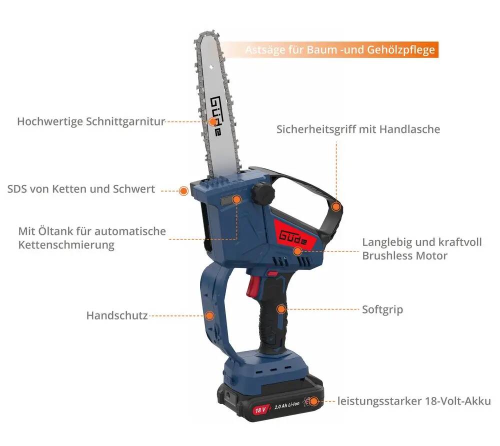 Deine neue Güde Akku-Minikettensäge GMK 18-201-05 kommt mit Kraft, Komfort und Kontrolle. Mach deinen Garten fit und erleichtere dir die anstehende Arbeit! Die Güde Akku-Minikettensäge GMK 18-201-05 trumpft mit vielen Features auf. Sie begleitet dich bei Einsatzgebieten wie das Beschneiden von Obstbäumen bis hin zur Pflege von Sträuchern und Ästen. Rund ums Haus gibt es häufig viel zu tun, weshalb das passende Werkzeug entscheidet. Dank ihres leichten Gewichts und der Ergonomie liegt die Minikettensäge ausgewogen in deiner Hand. Das ermöglicht müheloses Arbeiten, selbst bei längeren Einsätzen.